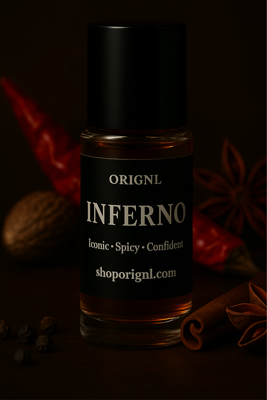 A fiery and refined scent that fuses bold spice with deep elegance. INFERNO opens with vibrant pink pepper and bergamot, moves through aromatic lavender and saffron, and finishes with rich leather, woods, and a smoky amber base — powerful, smooth, and undeniably intense. Made for anyone who wants to smell amazing, feel confident, and stand out—without the designer price tag.